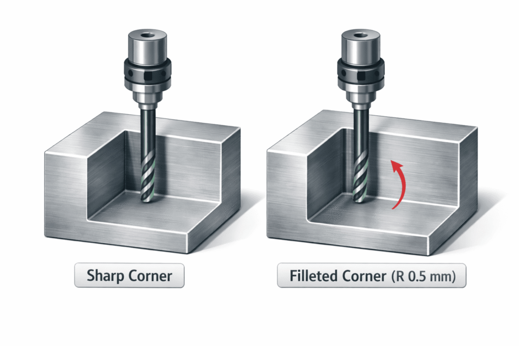 CNC cutting tools are round, which means perfectly sharp internal corners cannot be machined directly.