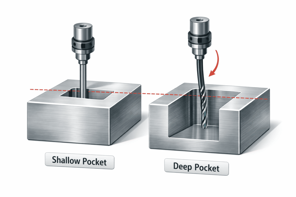 Deep pockets require long cutting tools. Long tools are less rigid and create vibration, deflection, and slower machining speeds.