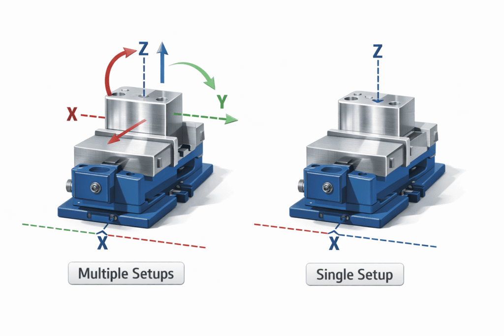 Each setup requires repositioning the part in the machine. Multiple setups increase labor time and the risk of alignment errors.